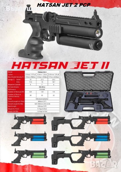 11. HATSAN JET 2 PCP , калибър 4.5 / 5.5 / 6.35мм в комплект със пластмасов куфат, 2 броя пълнителя (барабани), щуцер за зареждане, 1 кутия чашки.