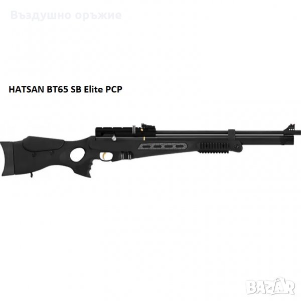 5. HATSAN BT65 SB Elite PCP, калибър 5.5мм , ремък за носене, 2 броя пълнителя (барабани), пластмасов куфар, ключалка за спусък, тактически фенер, О-пръстени и щуцер.