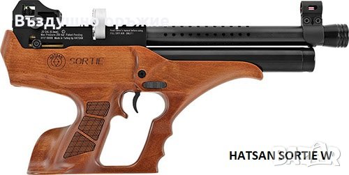 6. Автоматичен пистолет HATSAN SORTIE W, калибър 5.5мм с орехов приклад, в комплект със специална чанта за транспортиране, 2 броя пълнителя (барабани), щуцер за зареждане. Пистолета го има и във вариянт с черен пластмасов приклад (HATSAN SORTIE S на цената от 659 лв).