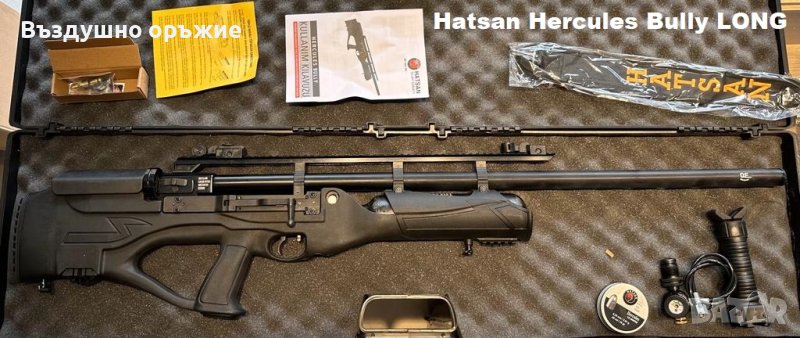 3.HATSAN HERCULES BULLY LONG PCP калибър 6.35мм. Това е нов модел с друга цев с дължина 76 см , която стреля много добре със слъгове (освен с чашки). Пушката идва в комплект с пластмасов куфар, ремък за носене, 3 броя пълнителя (барабани) , зарядна станция Хатсан (250бара) , ключалка за спусък, О-пръстени , щуцер за зареждане. Пушката има голям потенциал за вдигане на мощност и след тунинг може да достигне до 150 джаула в калибър 6.35мм.