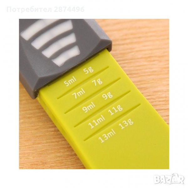 Лъжицата е разграфена в грамове и милилитри от двете си страни. Притежава плъзгачи с прегради, които могат да се изместват в желаната от вас доза: