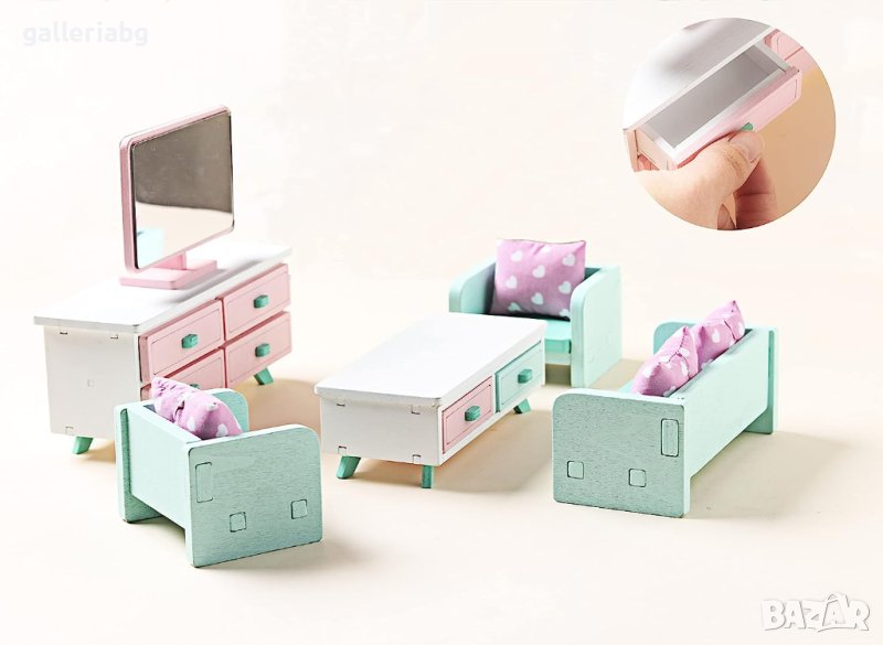 Дървена куклена къща, Комплект мебели за всекидневна, миниатюрни аксесоари за куклена къща, Обзавеждане за куклена къща с диван, маса и шкаф - мащаб 1/12