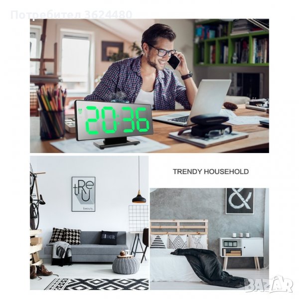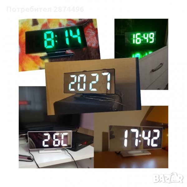 Настолен часовник с огледална повърхност, светещи цифри, аларма, дата, температура
