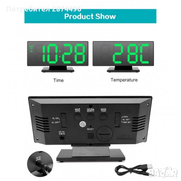 Часовникът трябва да е включен чрез USB кабела(който е в комплекта) за да показва постоянно. Само с батерии работи в енергоспестяващ режим и изгасва след кратък период. Батериите са 3 × ААА, не са включени.