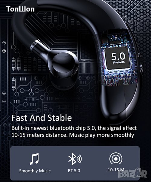 Интелигентна блутут слушалка с HD звук с анулиране на фоновия и вятърния шум , водоустойчива ! Регулируема на 270 °: Намерете перфектния ъгъл, който да пасне на ухото ви. Може да наблюдавате постноянно нивото на батерията на дисплея на телефона.