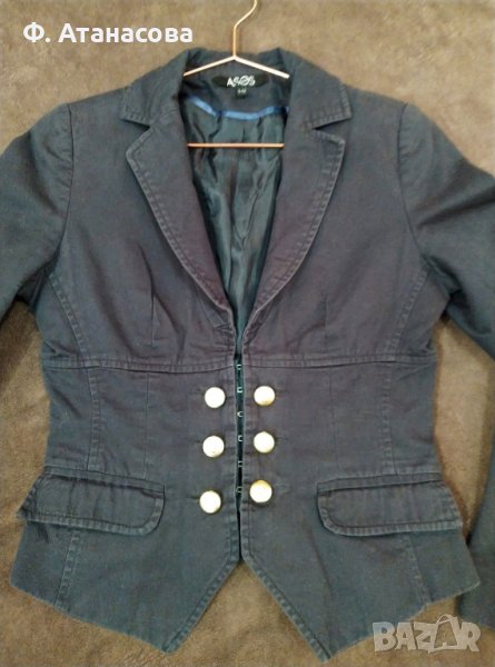Сакото е вталено и стои много елегантно. Материята е 100% памук. Има два джоба и декоративни копчета (закопчава се с дискретни вътрешни копченца). Стои еднакво впечатляващо с панталон или дънки и върху рокля за повод.