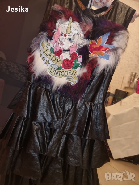 Уникална рокля на Djofra. Изкуствена кожа; прозрачен гръб мрежа с цип.