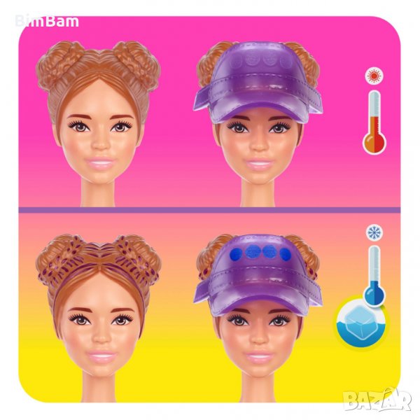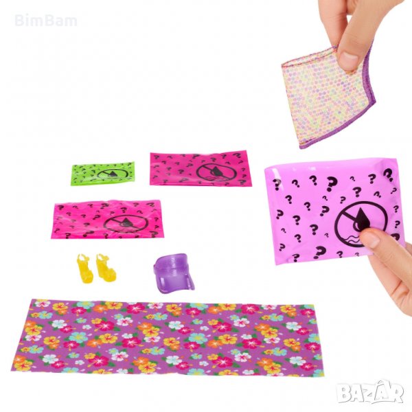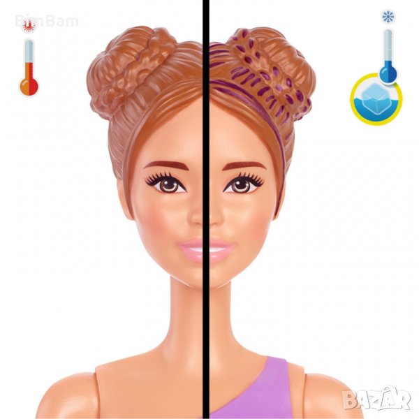Куклите Barbie® Color Reveal ™ са пълни с изненади! Кукла е облечена в пъстър бански костюм с шарки, но външният вид на всяка кукла остава загадка, докато не се разкрие. Опаковката е част от забавлението - издърпайте лентата, за да премахнете външния слой и разкрийте прозрачна бутилка. Вътре има тайнствена розова мраморна кукла Color Reveal ™ и четири торби, скрили изненади вътре. Извадете ги всички и напълнете бутилката с топла вода, след това поставете куклата и я завъртете. Водата става пастелно розова и тогава куклата ще разкрие нейните черти! Всяка кукла има различна комбинация от цвят на очите, формована коса, тон на кожата и декориран бански, но изненадите продължават. Отворете пликчетата, за да откриете - чифт обувки, аксесоар и кърпа! Ефекти за промяна на цвета върху куклите " коса и аксесоар добавят към изненадата и забавлението. Всяка серия има уникална тема - тези кукли Color Reveal ™ са изцяло за пясък и слънце. Използвайте бутилката, за да съхранявате всички изненади.. Коя кукла ще разкриеш? Всяка се продава отделно, в зависимост от наличността. Куклите не могат да стоят сами. Цветовете и декорациите могат да варират.