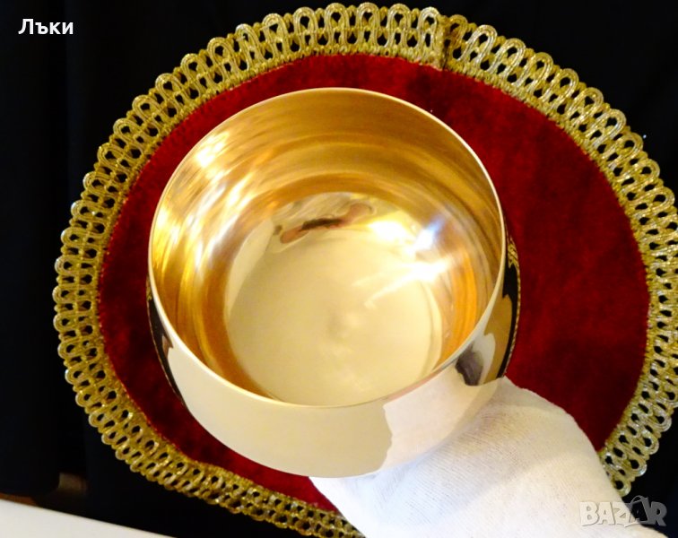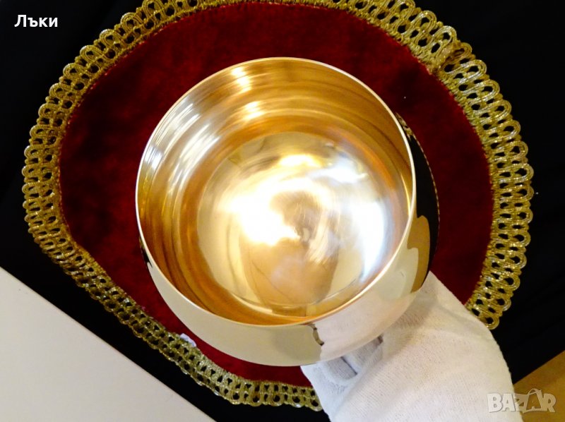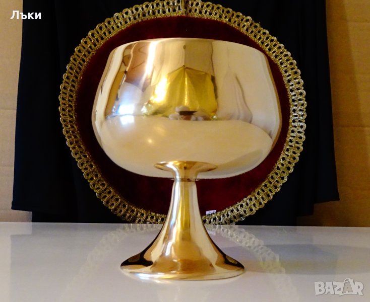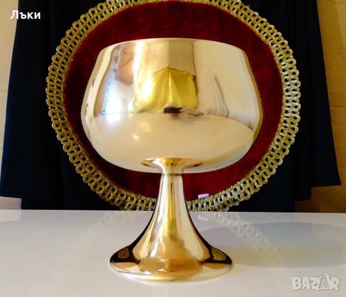 Старинен английски бокал за вино,чаша за вино,шампанско,майсторска ръчна изработка от масивен високо качествен бронз.Стилен класически дизайн с кристална гладкост и огледален блясък.Има празничен камбанен звън,който отзвучава дълго.Височина 13 см.,диаметър 12 см.,тегло 390 гр.Вместимост 500 мл.