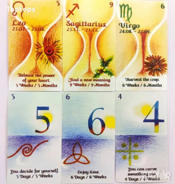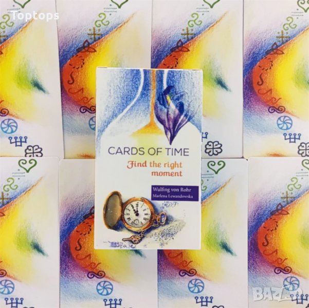 * Cards of Time е изключително интересна и директна оракул колода, която дава отговор на въпроси за време. 33-те карти са разпределени по следния начин: 12 карти за часовете, 7 карти за дните, 12 карти за месеците, 2 карти жокери.