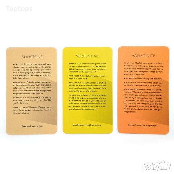 * Crystals the Stone Deck е колода с естествените минерали. Те имат сила в себе си, влияят ни, едновременно са и проводници и генератори и усилватели на заобикалящите ни енергии. С нея може да се работи по много начини. С усет и унтуиция за диагностика на енергията ни в момента, за определяне на това какво ни липсва. Или като съзнателен избор - когато искаме да привнесем в енергийното си поле силата на някой минерал.