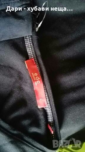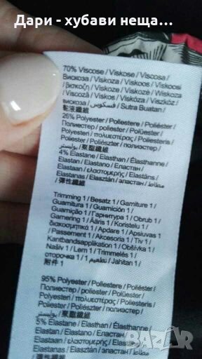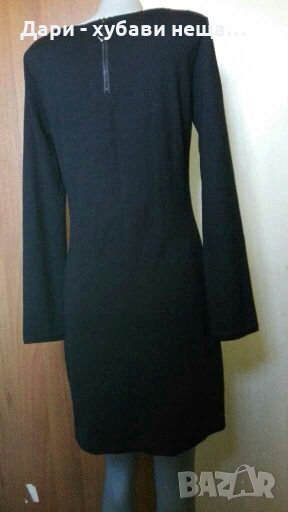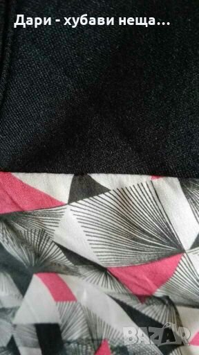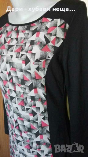 Чисто нова рокля от плътно качествено трико, в черно и платка от друга, цветна материя - сиво и тъмно розово.Кройката е вталена, дължината е малко над коляното и зависи от ръста и фигурата.Има умерена еластичност.Предницата е двойна, заради цветната част.