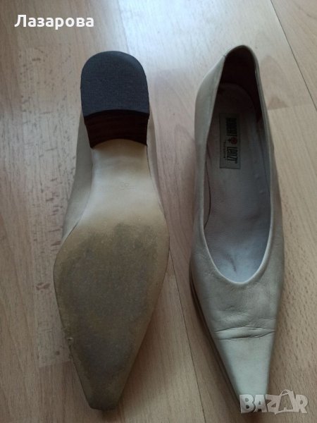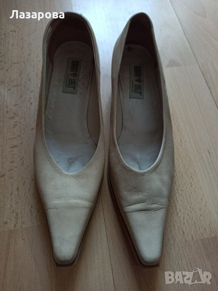 Обувките са в бежов цвят и са на марката Robert Lenzi. От естествена кожа са. Много са запазени, със сменена капачка на тока. Номер 40, дължина на стелката 30 см, заради удължението на обувката, височина на тока 3 см.