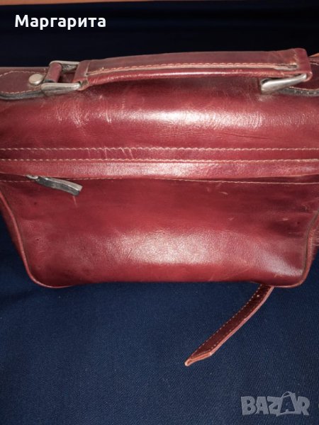 за малки по размер документи като карта за градски транспорт. Отпред има джобче, което се затваря с копче тик-так. С две дръжки. Размери 26 х 18 х 12 см. Има джоб с цип на гърба. Затваря се с копче тик-так. На гърба има 3 малки участъка като че ли боята е поизтрита, но кожата не е наранена. Много функционална и практична с двете дръжки.