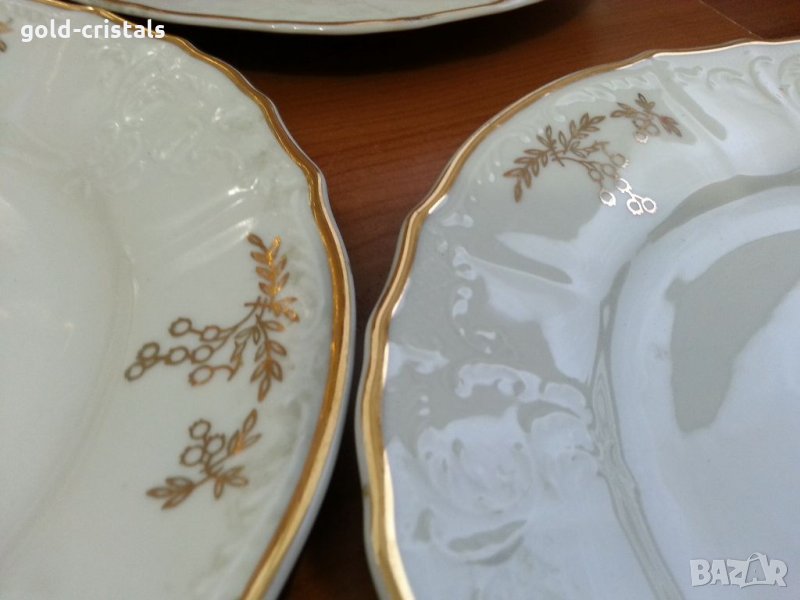 порцелан Чехословакия чинииплитки за основно 25см 6бр-180лв с златен кант бароков релеф без забележки прекрасно състояние има и дълбоки 5бр -149лв и две малки плитки предястие-15лв едната с малка забележка сервиз комплект сет лот ретро арт декор винтидж колекция стари антикварни предмети обзавеждане за дома и семейството подходящи за подарък за ценители и колекционери кухня готвене сервиране хранене гости трапезария маса празници подарък посуда съдове