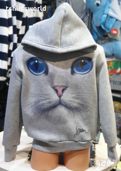 Нов детски суичър с 3D принт сива Котка със сини очи