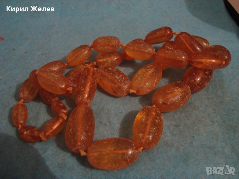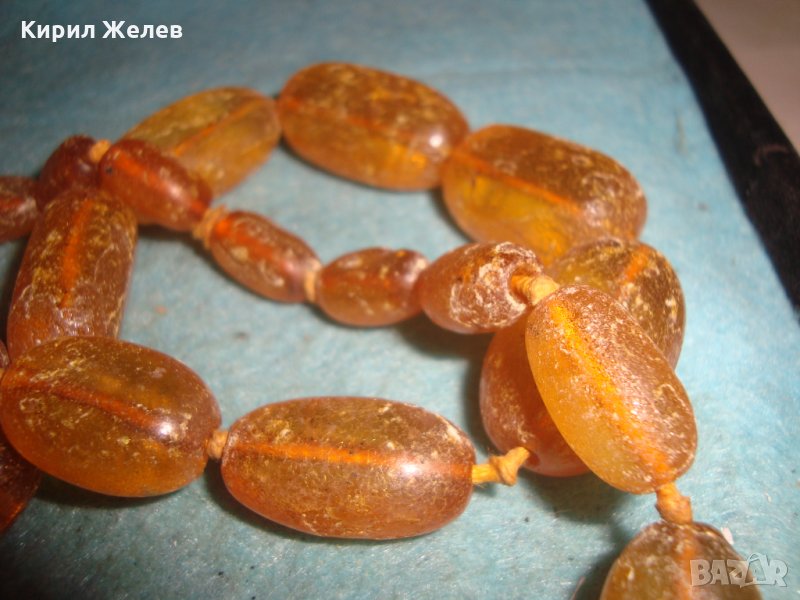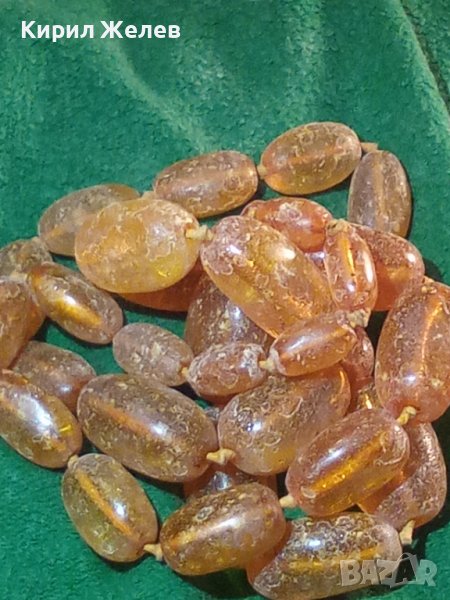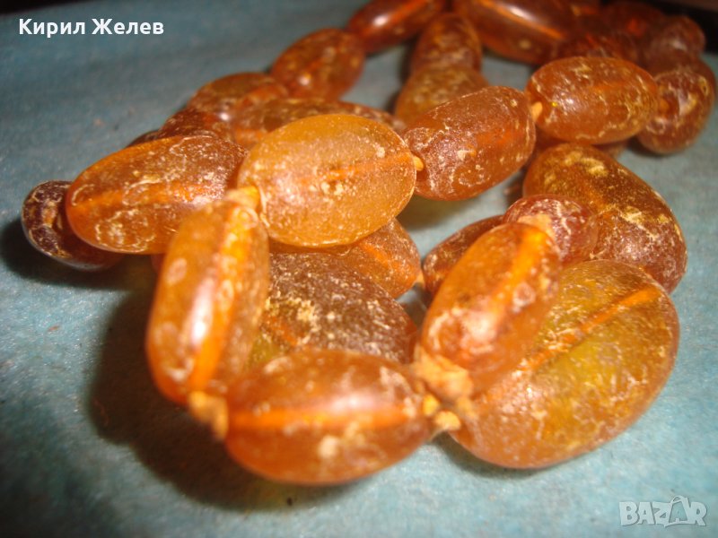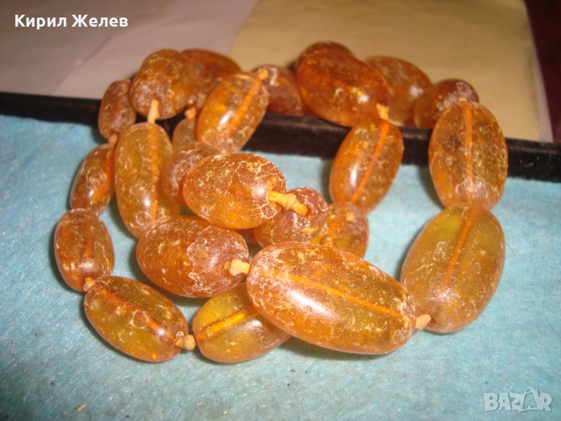 Началото на миналия век; изцяло ръчна майсторска ювелирна изработка, барабанно стругован естествен нетретиран балтийски кехлибар - ретро бижу-уникат. 100% автентичнет вид. Състояние видно - според снимките! Поради факта, че материалът е натурален кехлибар, който е крехък и трошлив, както знаят познавачите, разбираемо има повърхностни забележки - износване и охлузвания, които лесно могат да се полират и шлифоват от опитен бижутер. Общо 31 броя звена, всяко различаващо се видимо и по форма, и по текстура и по бистрота на цвета от останалите; подходящи и за направа на традиционна кехлибарена