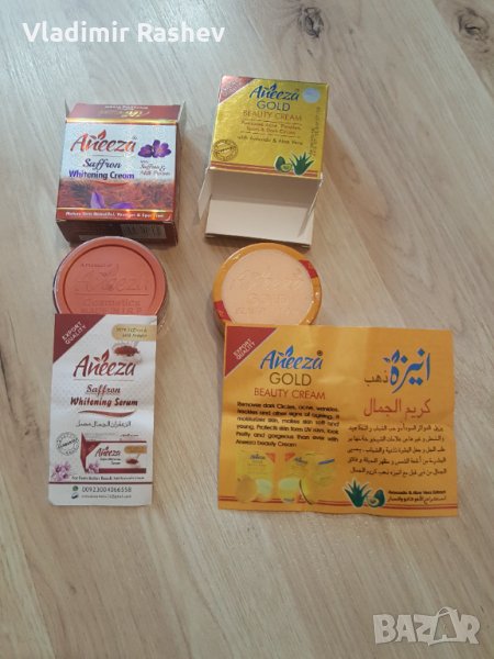 Aneeza Saffron Whitening Cream > Обогатен продукт с шафран и мляко за по-чист и фин тен на кожата. Млечните екстракти, които избелват кожата ви и я поддържат гладка и й придават млад вид. Тенът и кожата ви стават светли и без акне. Неговата органична формула е толкова нежна, че не възпрепятства естественото производство на мазнини на кожата, поради което поддържа младия й вид и лицето ви бива поддържано без стареене. След употреба не оставя мазни остатъци по кожата.Aneeza Gold Beauty Cream > Премахва тъмни кръгове на очите, акне, бръчки, лунички и други признаци на стареене. Овлажнява кожата, прави кожата мека и млада. Защитете кожата от UV лъчи, изглеждайте красива и по -прекрасна от всякога, с крем за красота Aneeza.Цена за 1 брой - 9 лв и 90 стотинки. Цена за комплекта от двата вида козметичен крем Анеза и Анеза Голд, 18 лв. За количества на едро, предлагаме специални оферти. Изпращаме със Спиди и Еконт с опция за преглед. Куриерска услуга за сметка на клиента. Моля, разгледайте и другите ми обяви.