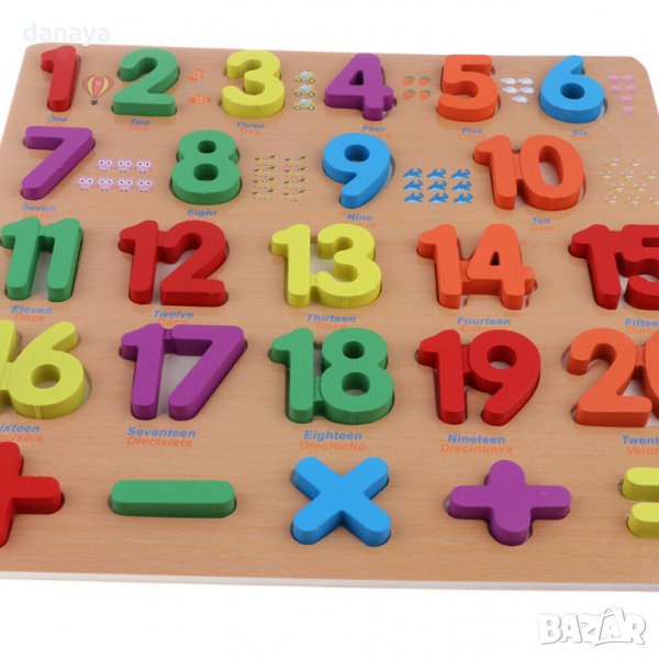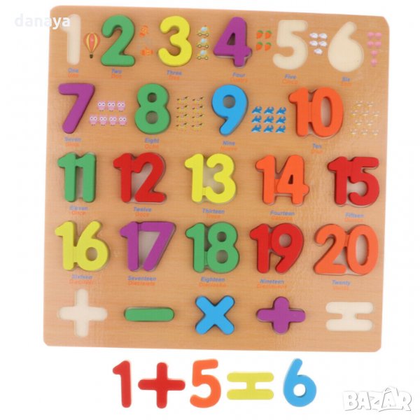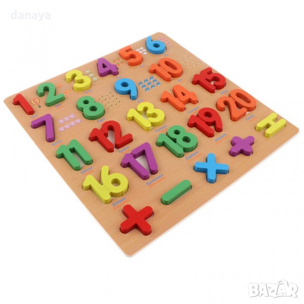 Детски образователен комплект – дървен пъзел с числата от едно до 20, заедно с математическите знаци.