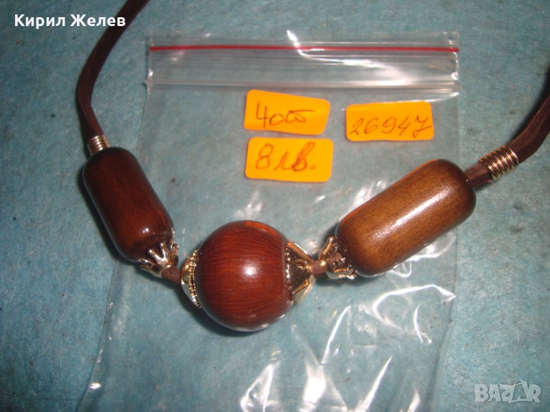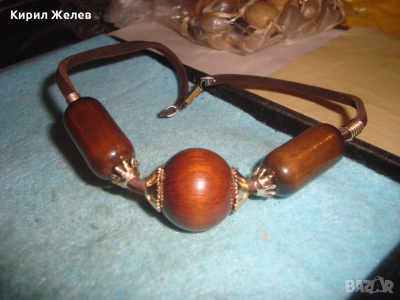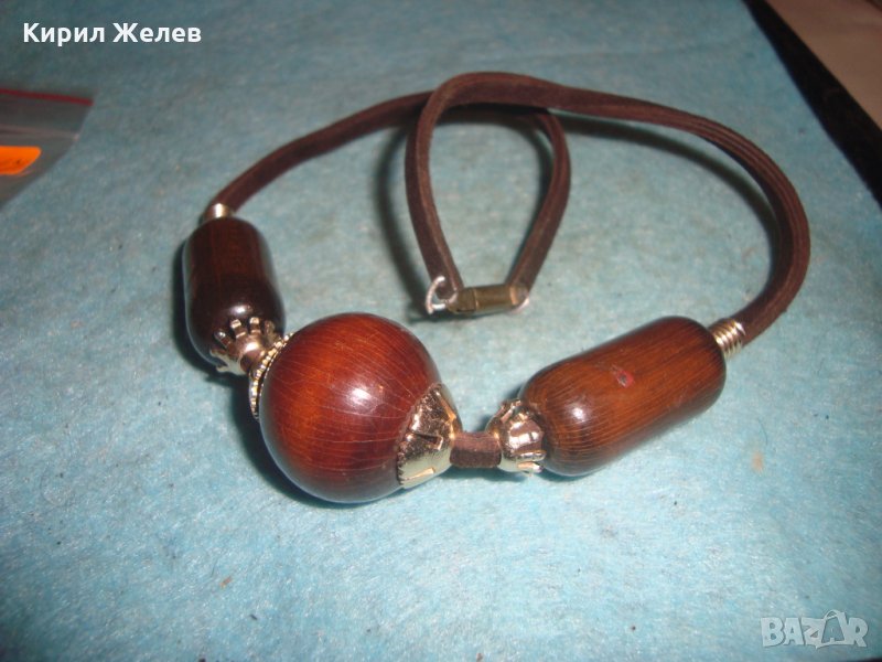 РЕТРО ОГЪРЛИЦА КОЛИЕ ДЪРВО ЛАКИРАНА ШНУР от КОЖА БРОНЗ АПЛИКАЦИИ ХУДОЖЕСТВЕНА ИЗРАБОТКА 26947