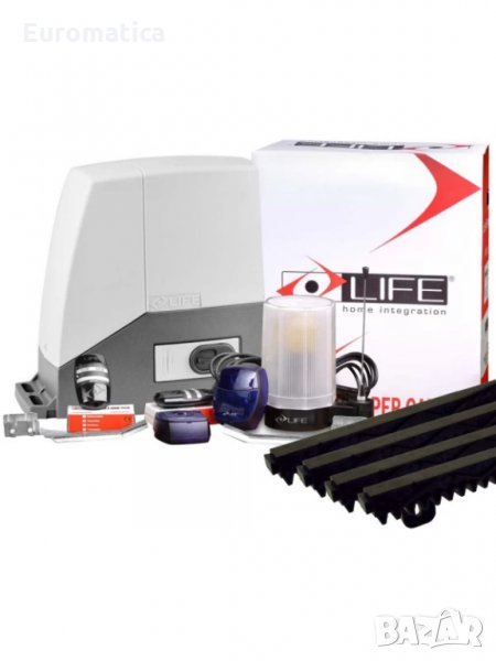 Релсата е с дължина 6 метра и е поцинкована. Комплектът се състои от: две колички 8-ролкови, насрещник, поцинкована релса 6 м, водещо колело с планка, държач с два фиксатора, задвижване за плъзгаща се врата Acer 400 UNI DL пълен комплект с 2 дистанционни Fido 2, фотоклетки Visio, антена за по-голям обхват, монтажна планка, 2 бр. крайни изключватели, 4 м рейка. 3 години гаранция