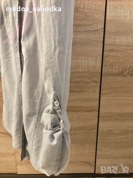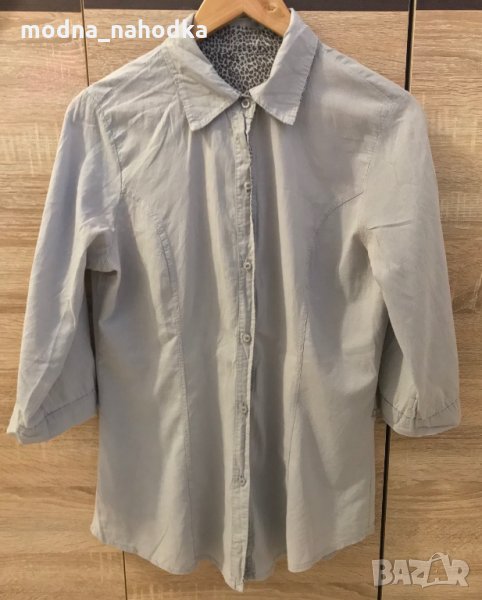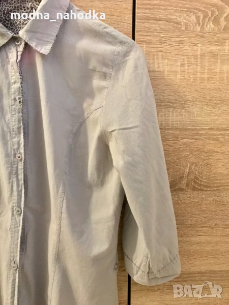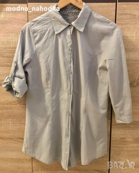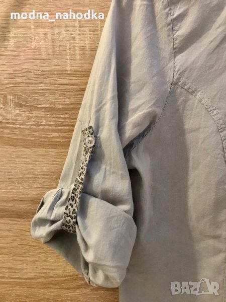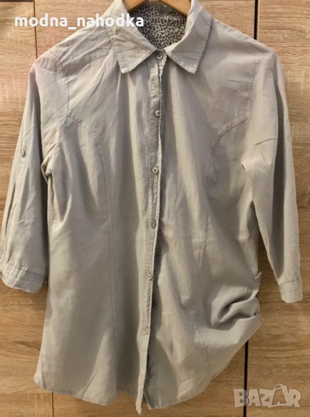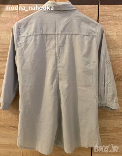 Сива изчистена дамска риза размер L. Няма забележки, има възможност ръкавите да се прибират (виж снимките) също така и страните на ризата (отново виж снимките).