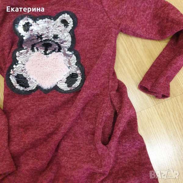 Страхотна зимна рокля/туника в тъмно червено! Няма забележки! Мечето е с обръщащи се пайети - сиво към розово. Има джобчета!