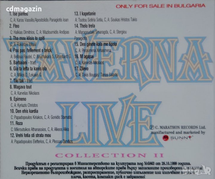 Компакт дискове CD Taverna Live Collection II, снимка 1 - CD дискове - 35091568 Компакт дискове CD Taverna Live Collection II, снимка 2 - CD дискове - 35091568 Компакт дискове CD Taverna Live Collection II, снимка 3 - CD дискове - 35091568 1/3