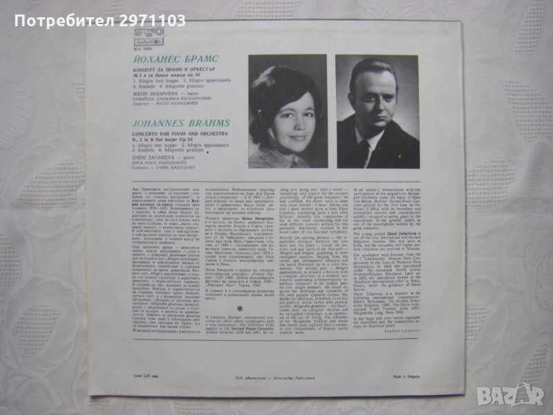 Грамофонна плоча - ВСА 10291 - Йоханес Брамс. Концерт за пиано и оркестър - Жени Захариева - пиано