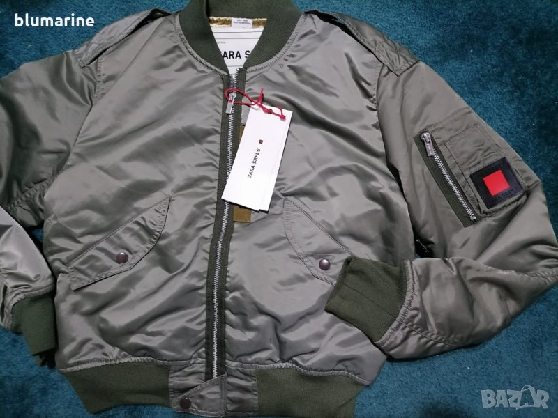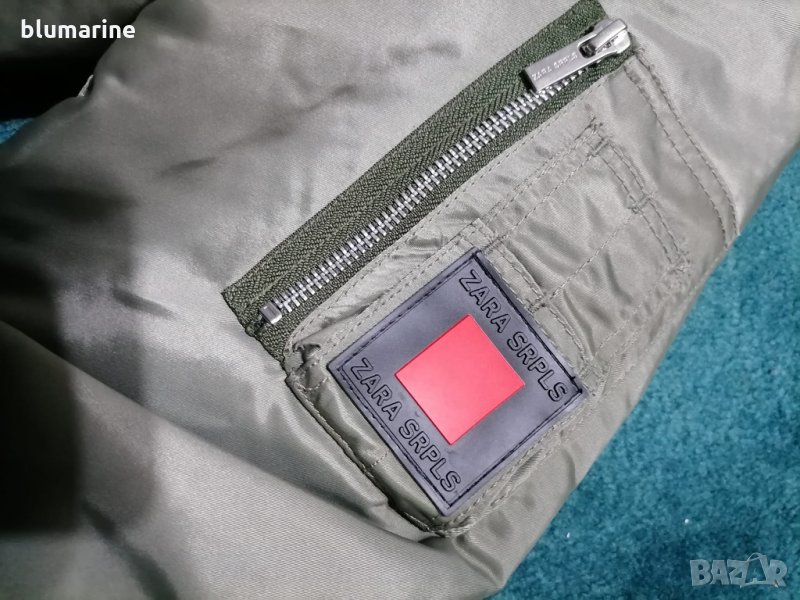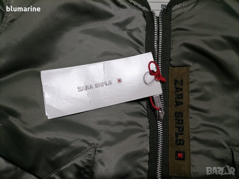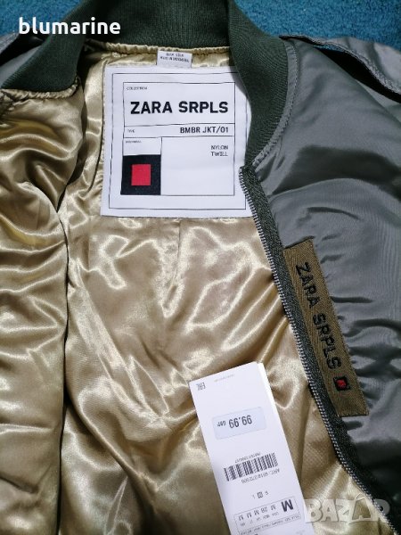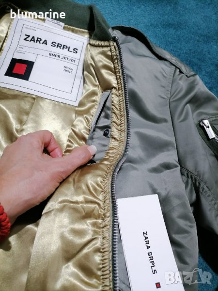 Дамско спортно яке ZARA SRPLS. Влаго и студоустойчива материя.Закопчаване с цип. Два долни джоба и един вътрешен с копчета тик-так.Малък джоб на единия ръкав с цип. В долната част на ръкавите и якето е с ластик. Два пагона на раменете. Модел 2021 година