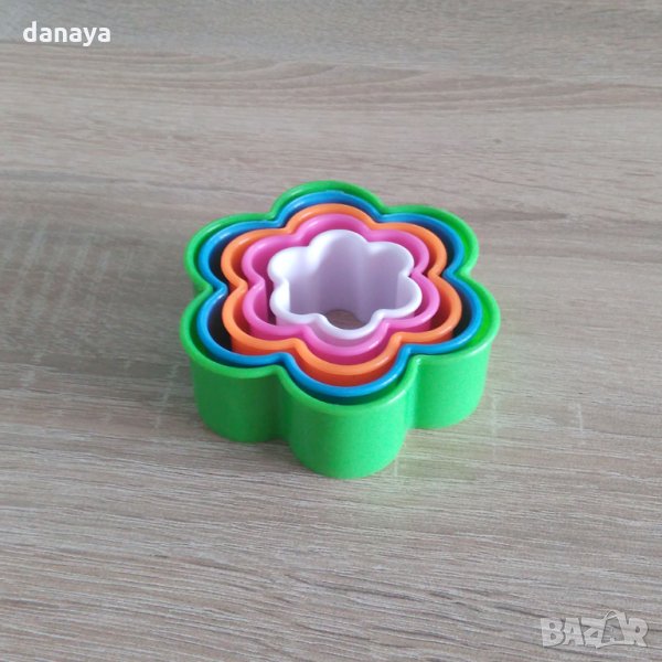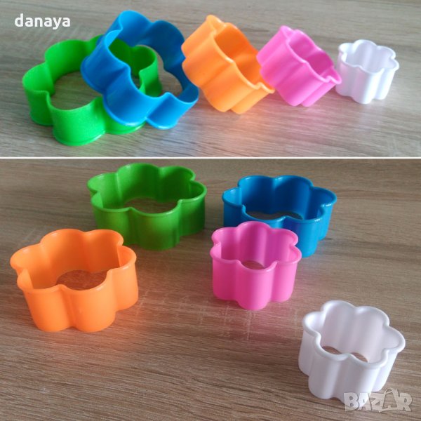 Пластмасови форми за рязане на тесто и оформяне на дребни сладки курабии, меденки, бисквити. Формичките са в комплект от 5 броя с форма на цвете, като всички са с различен размер и цвят.