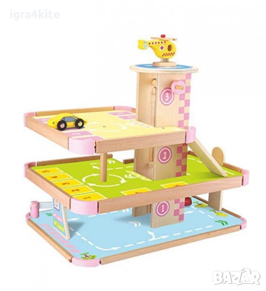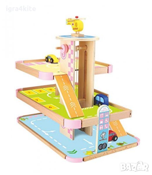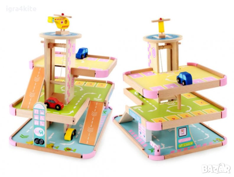 Голям дървен паркинг на 4 нива с дървени колички и хеликоптер