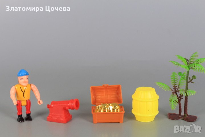 Пластмасова играчка. Комплектът съдържа кораб, фигурка на пират, сандъче със злато, дърво и други аксесоари. Размери на кораба-27*9*23 см. Височина на пирата-6 см. За деца над 3 години.