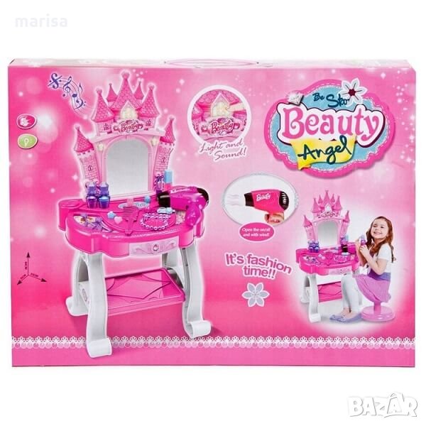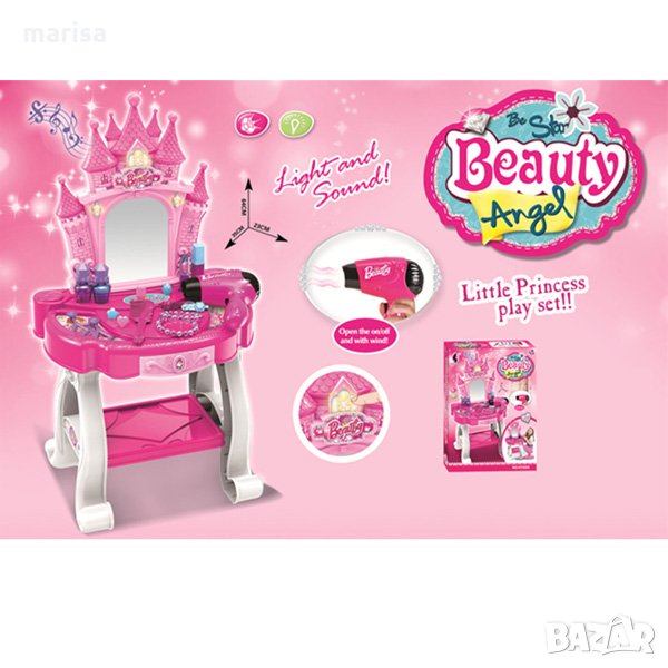 Този красив комплект включва сглобяема тоалетка с вълшебно огледало (свети, музикална), електрически сешоар, червило, 3 бутилки, 4 пръстена, 2 фиби, четка за коса, 2 гривни, чифт обеци.