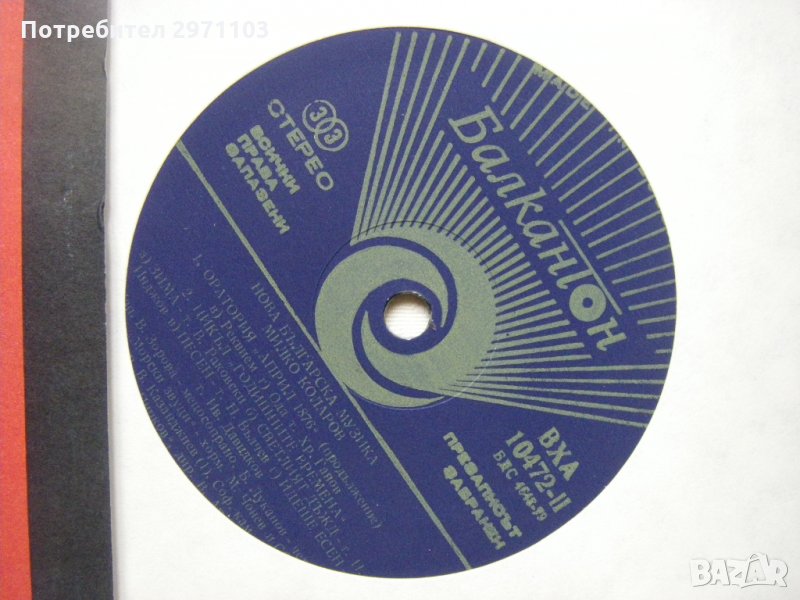 Изп. В. Зорова — мецосопрано, Б. Луканов — четец, хор „Морски звуци" — хормайстор М. Чонев и Симфоничннят оркесгър на Българското радио, диригент В. Казанджиев (1), Соф. камерен хор "Л. Пипков“, диригент В. Арнаудов (2).