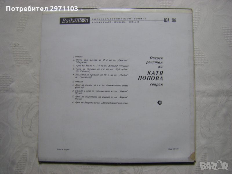 Грамофонна плоча - ВОА 302 - Оперен рецитал на Катя Попова - сопран
