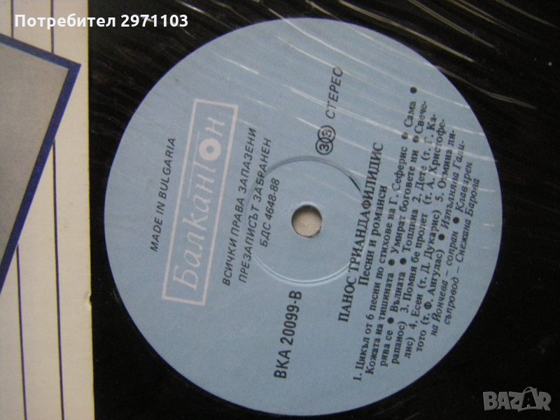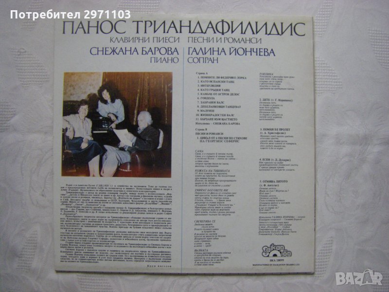 Грамофонна плоча - ВКА 20099 - Панос Триандафилидис. Клавирни пиеси, песни и романси; изп. Снежана Барова - пиано, Галина Йончева - сопран