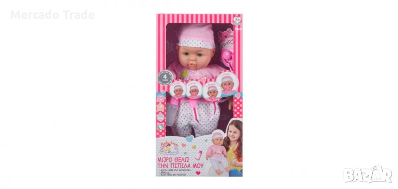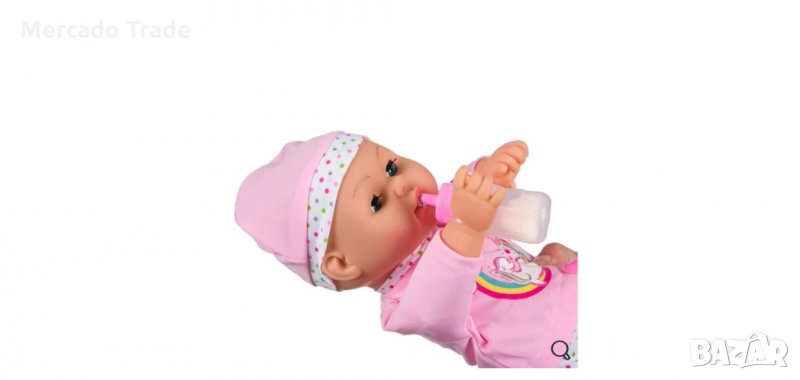 Играчка за момиченце, кукла бебе 38 см със залъгалка. Когато извади залъгалката, той казва сладки думи на английски и издава красиви звуци, докато когато има залъгалката е щастлив. Той държи бутилката в ръка, а залъгалката му е прикрепена към тениската.