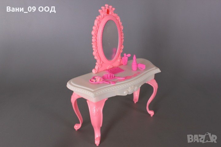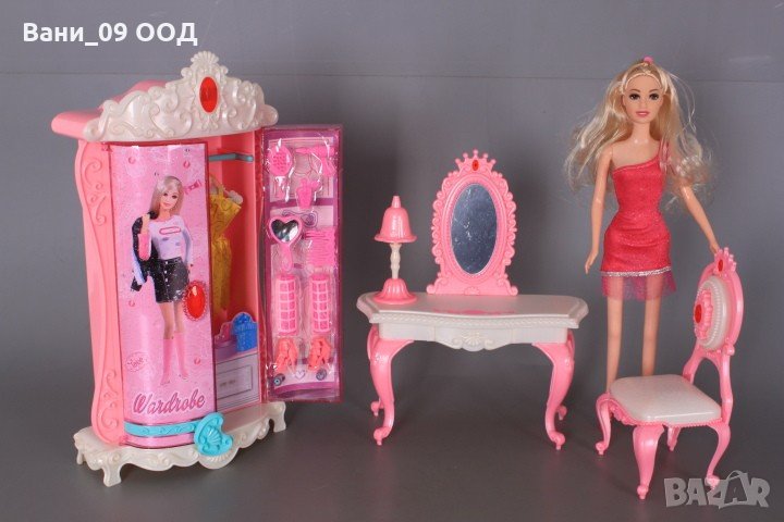 Комплектът съдържа кукла с чупещи се крака, тоалетна масичка с огледало, абажур, стол, гардероб, допълнителни рокля и обувки за куклата, гребенче, коронка, обеци и други аксесоари. Височина на куклата-30 см. Размери на гардероба-16*8*31 см. Размери на тоалетката-19*8*23 см. Размери на стола-8*8*18 см. Премахнете защитното фолио от огледалото! За деца над 3 години.