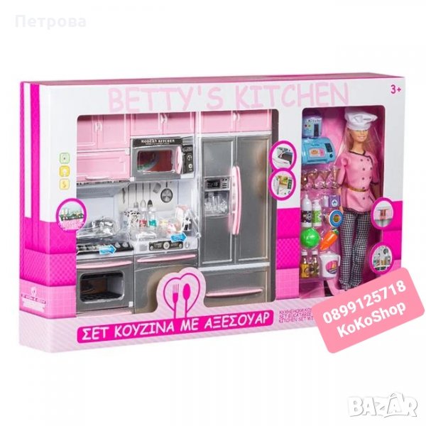кукла. Комплектът съдържа кукла-готвач и кухня снабдена с всички необходими уреди и аксесоари-фурна, котлони,микровълнова печка,миялна машина,огромен хладилник с диспенсер за вода. Също така са включени съдове да готвене и сервиране и хранителни продукти.