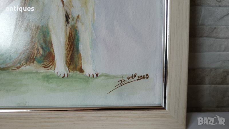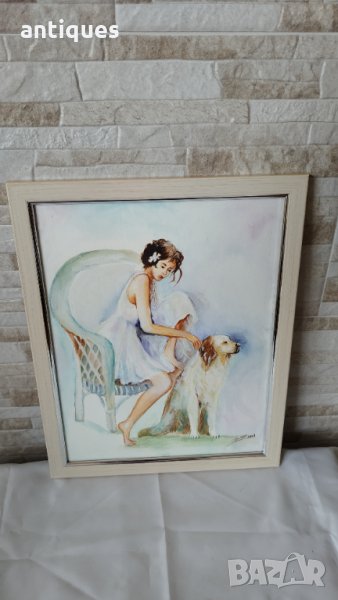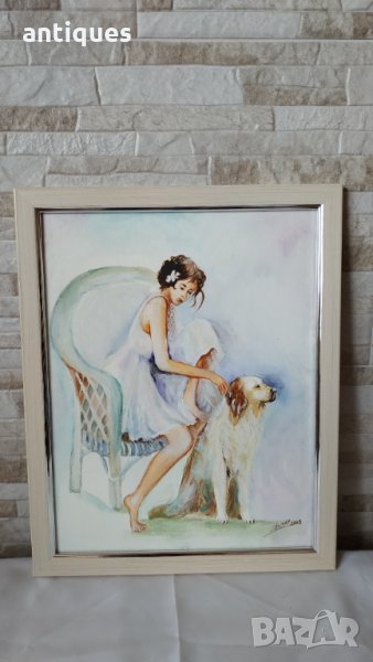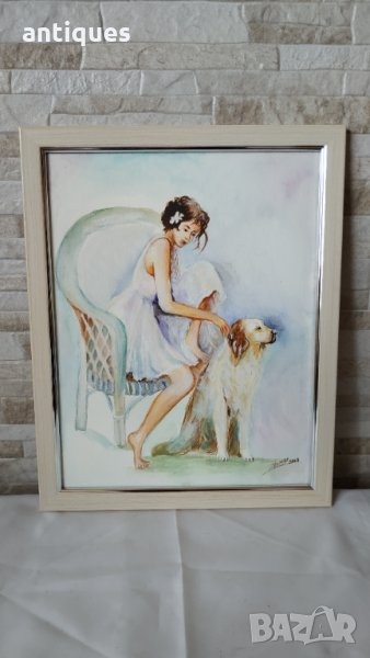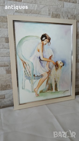 Картина "Момиче с куче" - акварел върху картон - рамкирана → Обява 35141816
