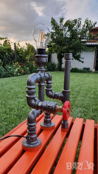 Настолна LED Vintage Pipe Lamp - Warrior. Изработена от метални поцинковани фитинги. Боядисана с черен хамершлак, който и придава уникален вид. Включва се при завъртане на кранчето. Крушката е от серията LED Fillament.