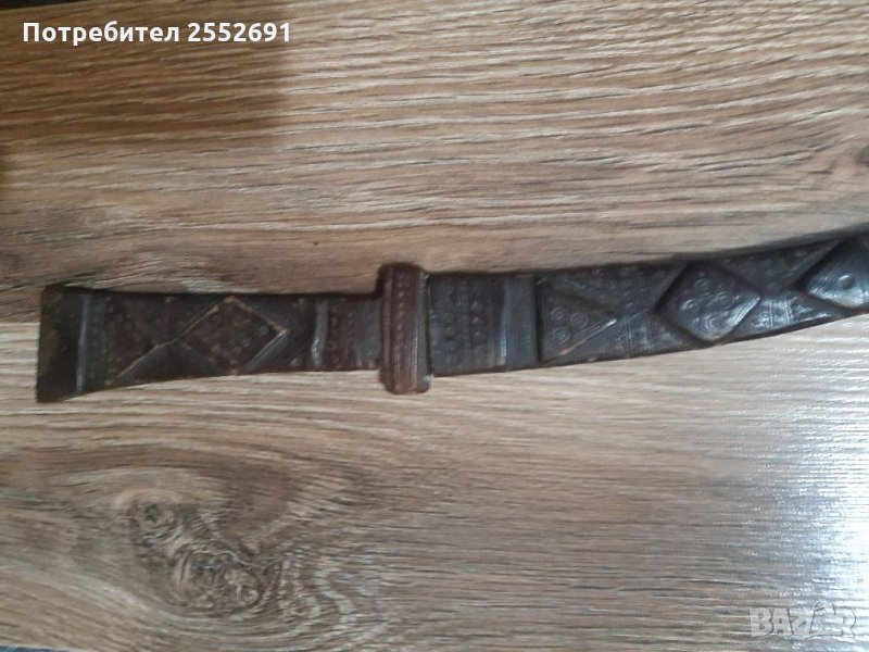 Старинен, ръчно изработен и инкрустиран нож с метална кания. Канията и дръжката са обвити с релефна , оригинална , ръчно щампована кожа. Дължина-33см. Ширина в основата- 3,5см.