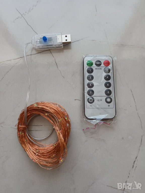 Продавам нови коледни LED лампички - многоцветни с дистанционно управление, 8 режима на светене. Режимите могат да се смянят, както ръчно, така и чрез дистанционното управление. Имат настройка на яркостта на светене от самото дистанционно. Възможност за управление на режимите на светене от също от дистанционното, on/off и още функций. Водоустойчиви. Уникалното при тях е, че не са като стандартните лампички с мек кабел, а са прикрепени към тънка медна тел, която може да се огъва и приема каквато форма вие пожелаете, което само по себе си предразполага за лесно прикрепване не само към елха, но и към предмети с неправилна форма. Захранват се през USB, като може да ползвате и обикновено зарядно за мобилен телефон за захранване.