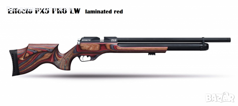 2. Effecto PX5 Pro LW Laminate PCP , (ламиниран приклад с различни цветове червен, син, оранжев и маслено зелен) , калибър 5.5мм , 2 броя пълнителя (барабани) , модератор , О-пръстени , щуцер за зареждане , 1 кутия чашки.