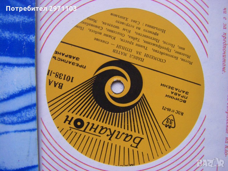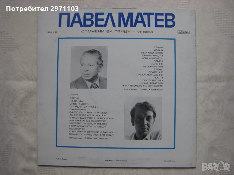 Грамофонна плоча - ВАА 10138 - Павел Матев. Спомени за птици - стихове. Изпълнява Сава Хашъмов