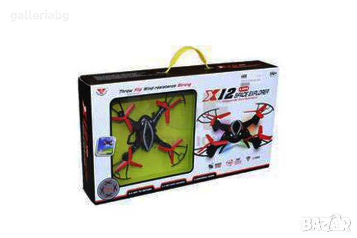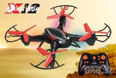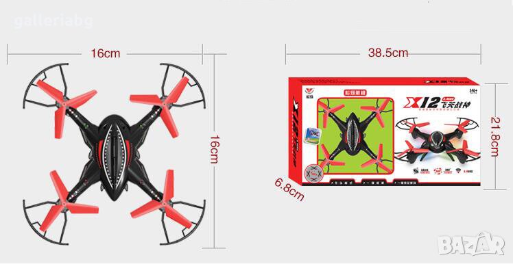 Дронът X12 с дистанционно е малък и удобен летящ апарат, подходящ за деца над 14 години. Дистанционното работи на честота от 2.4 Ghz , което прави управлението на дрона супер надеждно и прецизно. Презареждаща се Li-on батерия, която издържа до 7 мин. летене. Може да се използва както на открито, така и на закрито. Устройството не е професионално и е подходящо основно за забавление на деца.