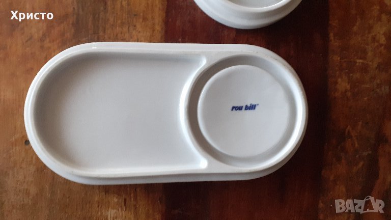 Продавам чаша бял порцелан с подложка и чинийка от Рубил Rou bill Германия супер качество, висока 11 см, ф-основа 6 см, ф-отвор 7 см, порцеланова подложка и чинийка, 7 броя пластмасови сменяеми рингове за декорация на дръжката. Произведена в Германия.