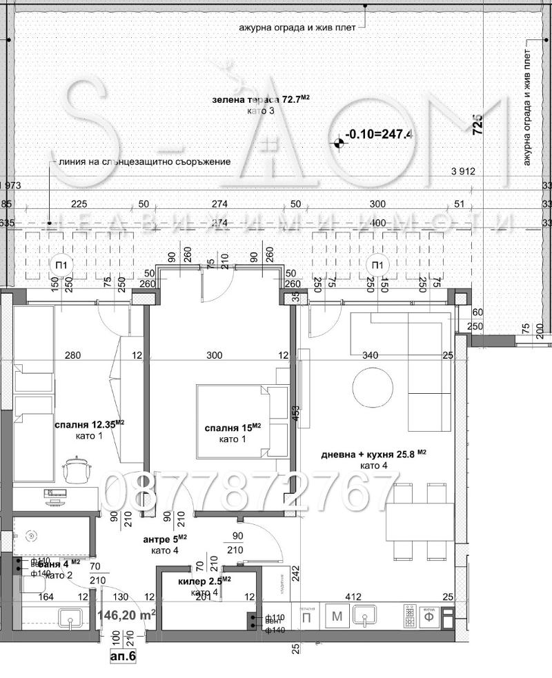 Състоящ се от => дневна с кухня, две спални, баня с тоалетна, коридор, килер и ОГРОМНА ЗЕЛАНА тераса 72кв.м..