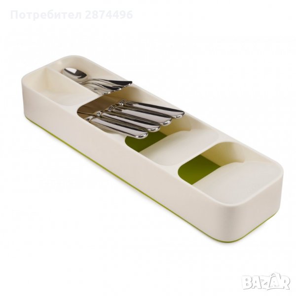Компактен органайзер за прибори има изчистен дизайн в правоъгълна стеснена форма, разграфена на четири отделения за всички прибори - три големи и едно по-малко. По-малките са идеални за чаени лъжички и вилички.